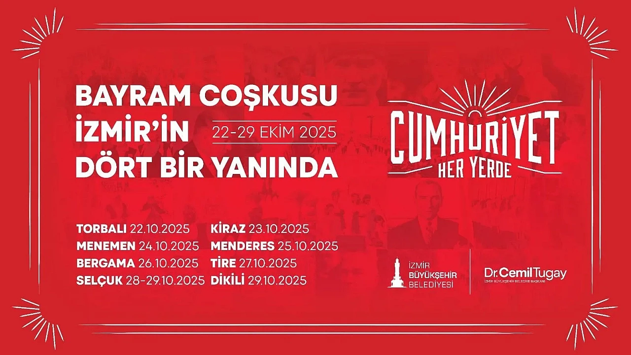 İzmir Büyükşehir Belediyesi, 29 Ekim’e kadar sürecek kutlama programlarını Menemen, Bergama, Selçuk, Kiraz, Menderes, Tire ve Dikili ilçelerinde de gerçekleştirecek.